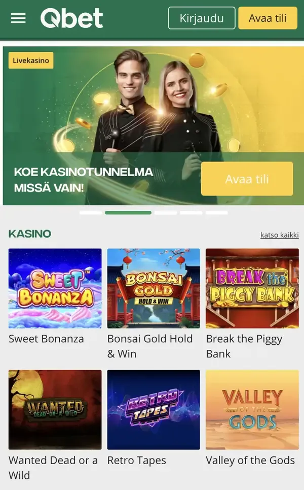 Pelaa mobiilissa avaamalla selaimesi ja siirtymällä Qbet Casino -verkkosivustollemme. Napauta valikkoa päästäksesi peleihin, kassalle, kampanjoihin ja tiliasetuksiin ilman, että vaihdat näkymiä. Tilille pääset yläosasta Qbet kirjautuminen -kohdasta, jonka jälkeen valitset haluamasi pelikategorian. Jos haluat nopean pääsyn, voit lisätä pikakuvakkeen, jolloin sivustomme avautuu kotinäytöltä kuten Qbet-mobiilisovellus -kuvake.